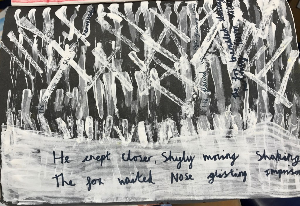 Arts lead Georgia had attended network sessions with Isabel Stephens, Head of Newlyn Primary, and CPD sessions with Melanie Cox from Gomersal Primary (see previous RAPS blog posts for Newlyn and Gomersal). She told us how the students were now using their sketchbooks in a more exploratory fashion.